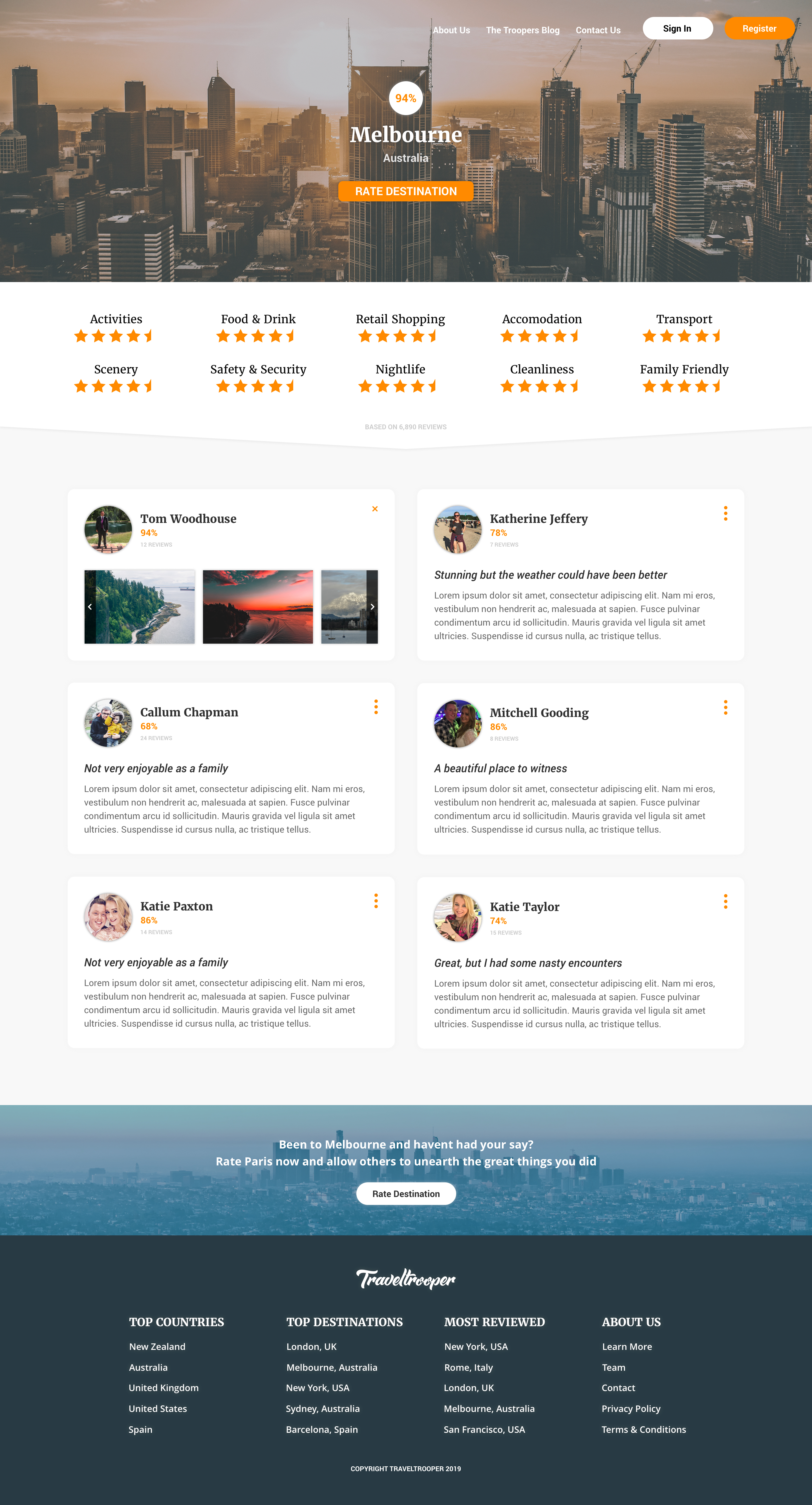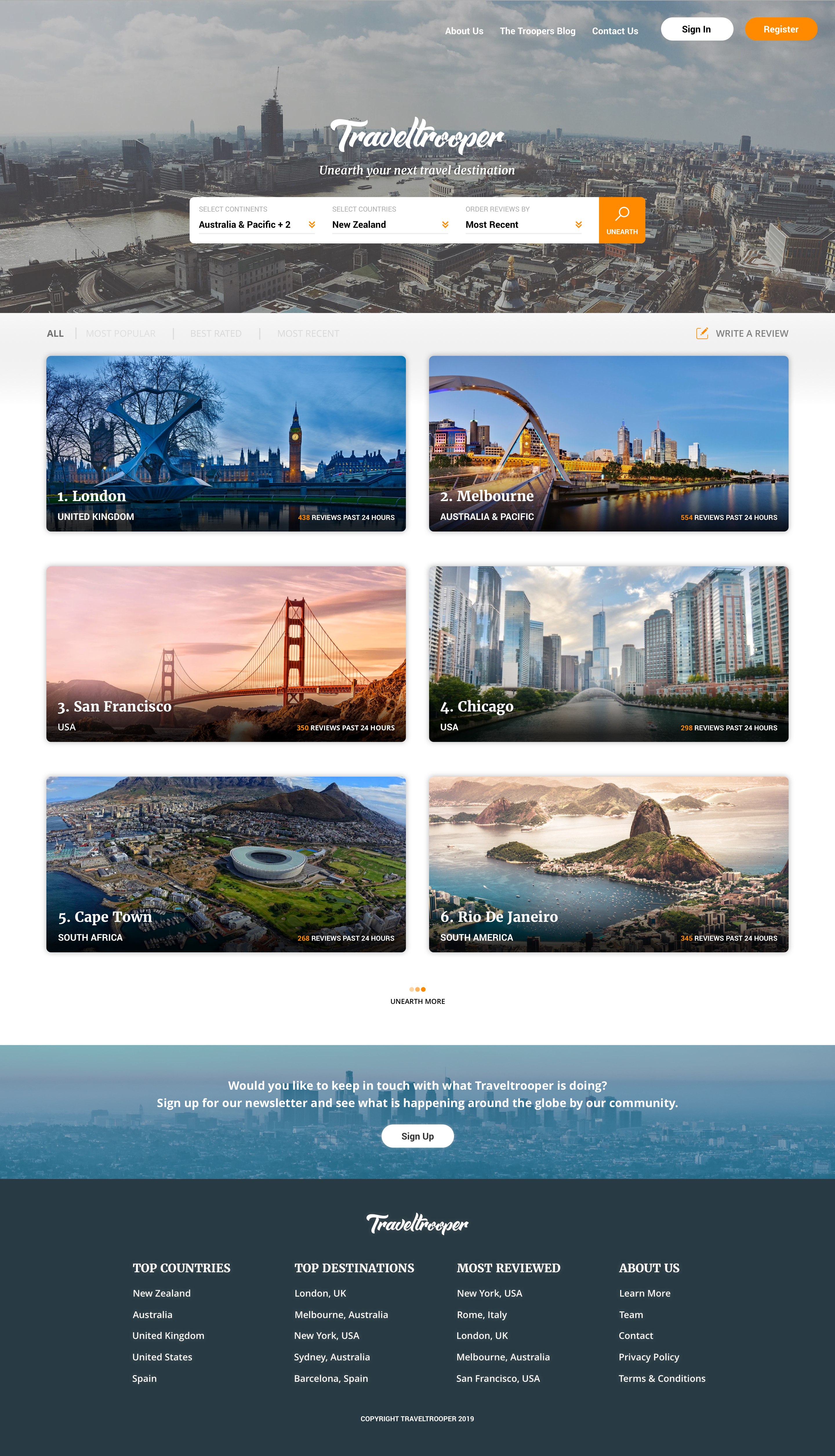 Traveltrooper was a concept website and app for reviewing and finding hidden gems. It was designed for the responsive web with the intial site being promoted online before moving onto a cross platform service.